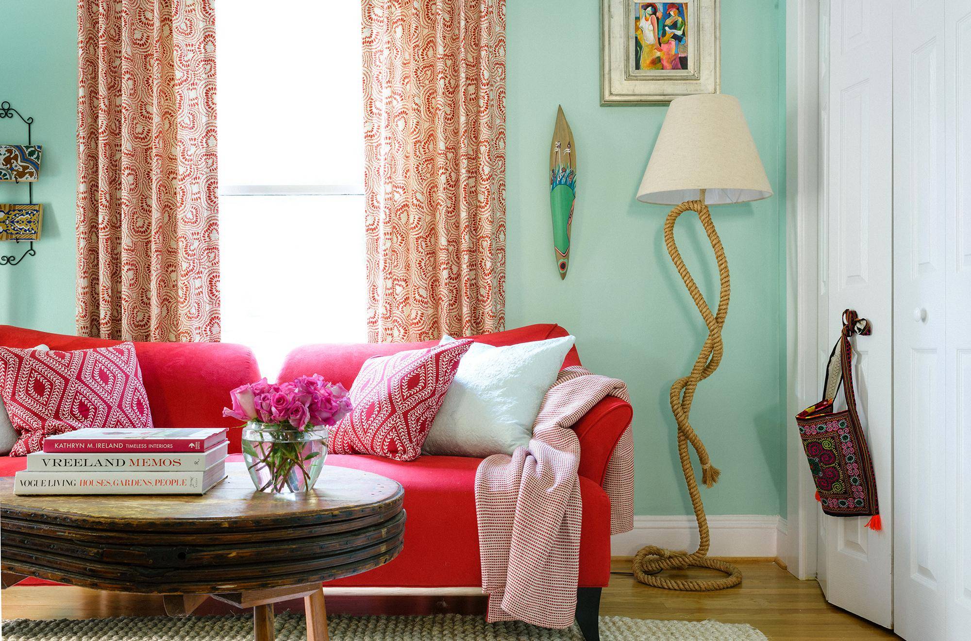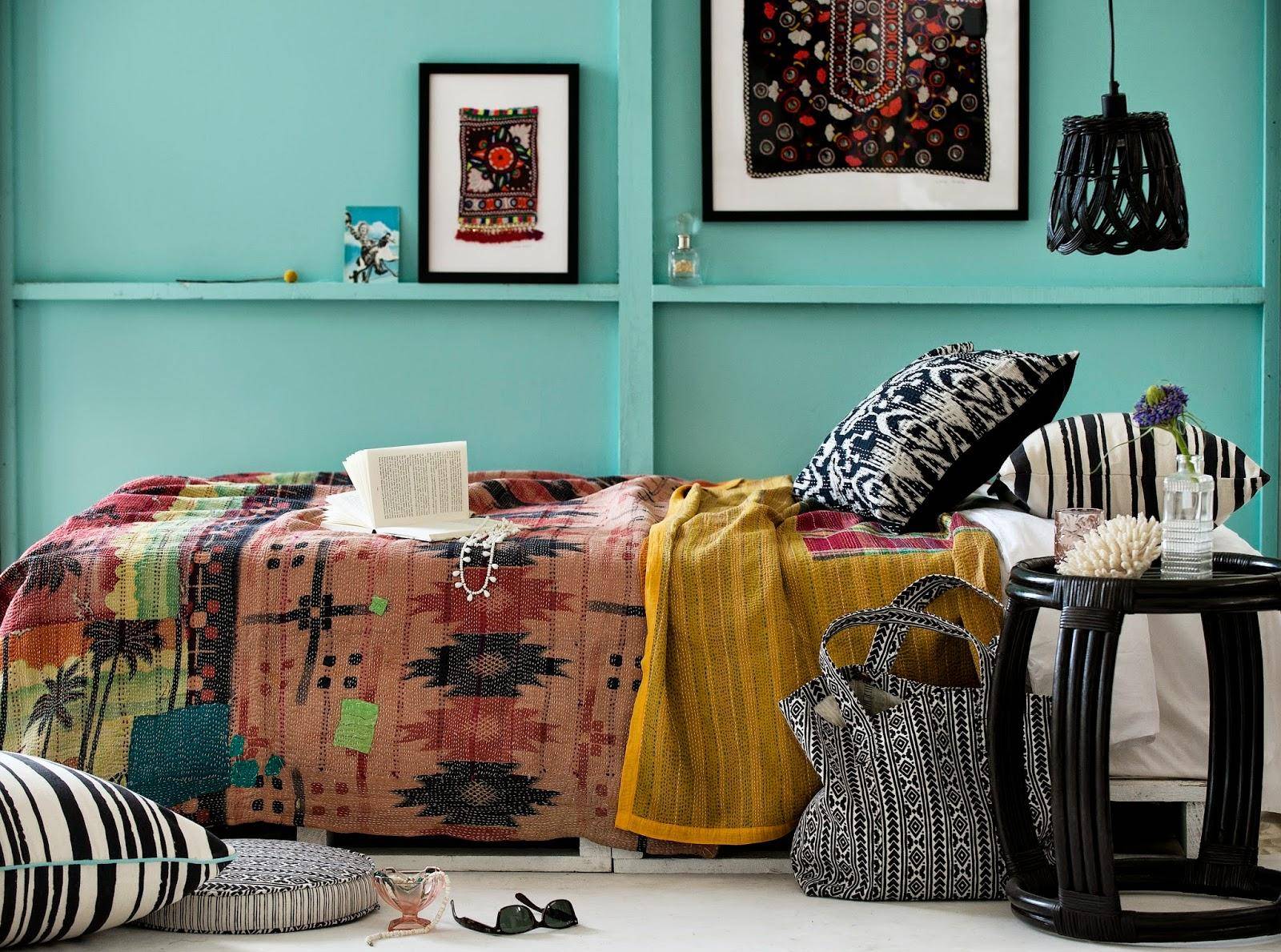 Спальня в стиле бохо с бирюзовой стеной