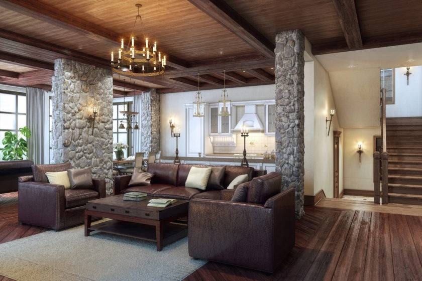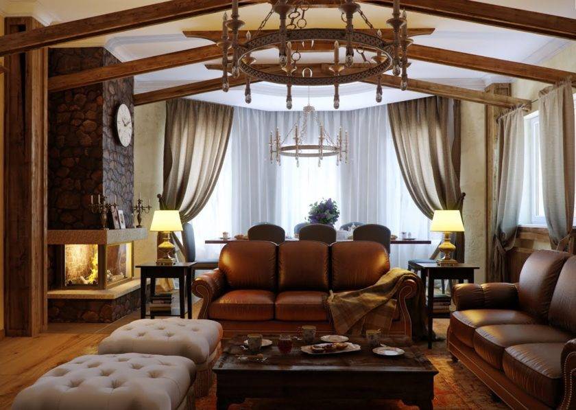 Грубо отделанные доски, мебель, обитая жесткой тканью, кожей и мехом, цветастый текстиль, люстры из рогов животных, посуда из металла отличают эту тематику.