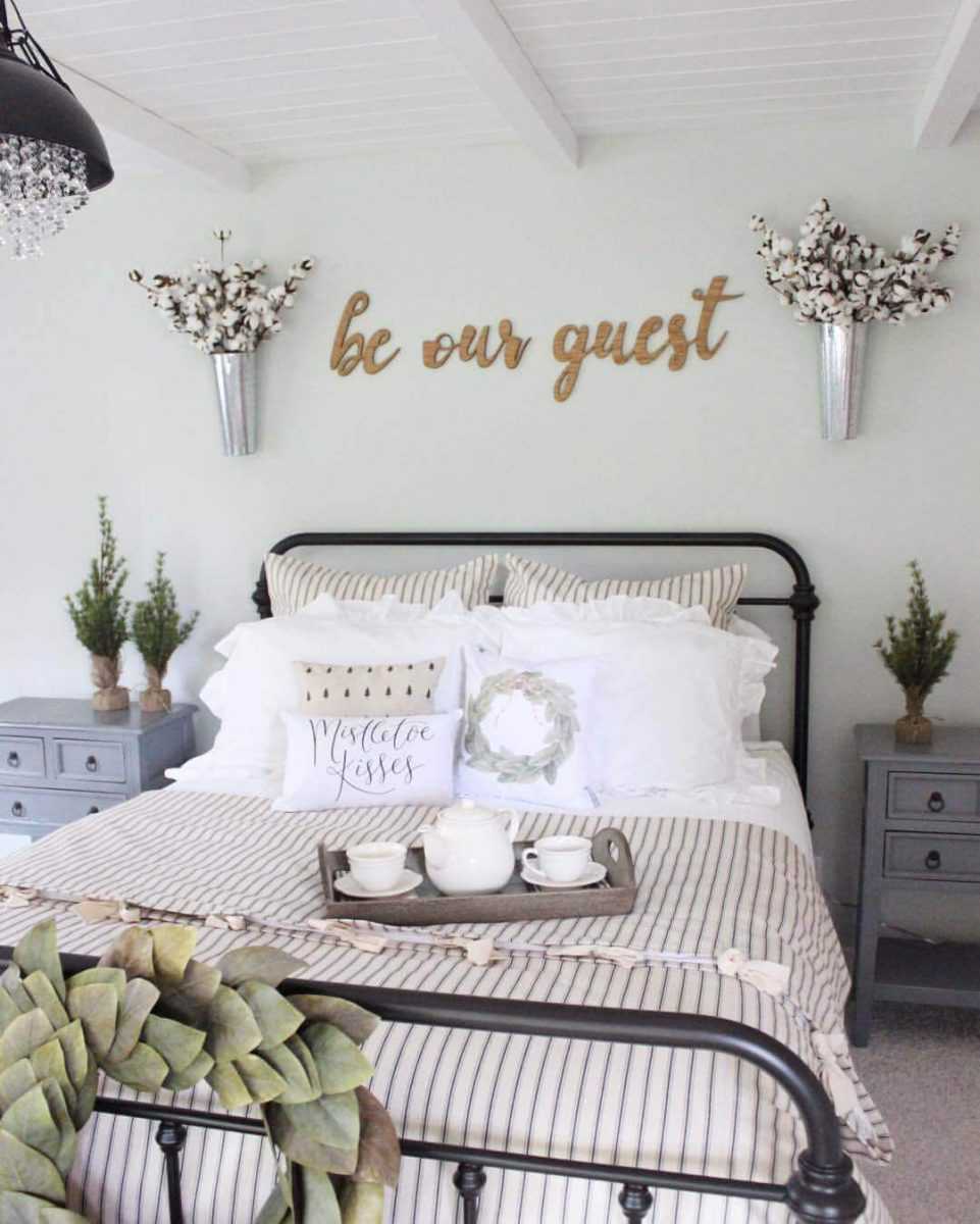Главное для спален в деревенском стиле — это использование натуральных материалов, а также изделий ручной обработки, таких как ковка