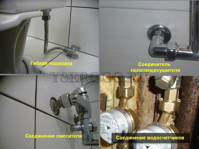 Таких примеров масса: соединение водосчетчика; соединение настенного смесителя с эксцентриками; гибкая подводка с гайкой; большинство хромированных соединителей для