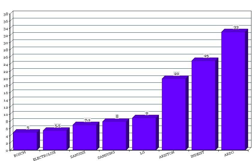 - AMANA, MIELE, FRIGIDAIRE, AEG относятся к сегменту «премиум». Дорогие модели обеспечат безупречную работу в течение 10–15 лет. Здесь и современный дизайн, и разнообразный функционал, и качественные комплектующие. Небольшой процент отказов связан с неправильной эксплуатацией и порчей электроники. Не стоит забывать, что управление чувствительно к перепадам напряжения в сети.