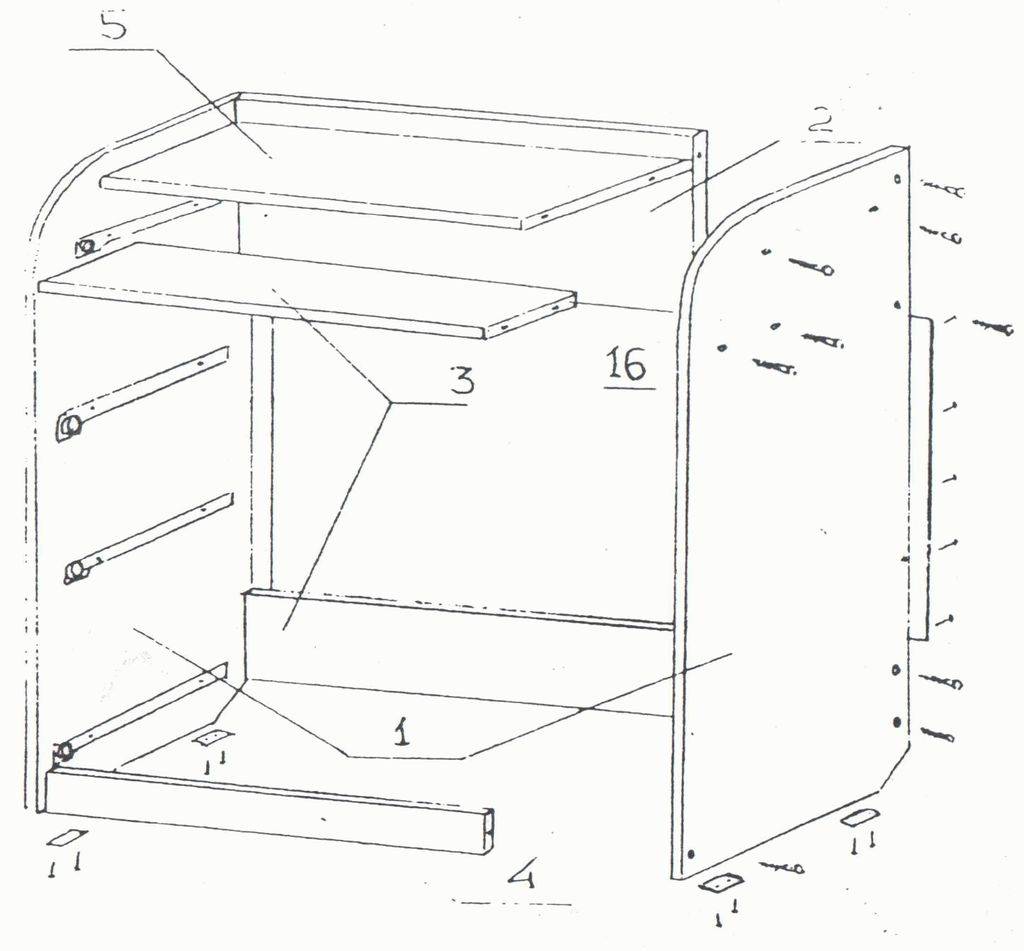 - сборка должна начинаться со столешницы: ее надо закрепить на боковушки или на ножки, далее установить нижнюю полку, потом остальные части;