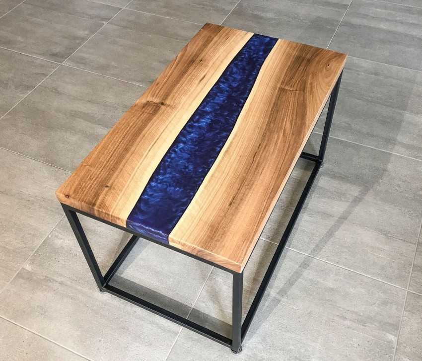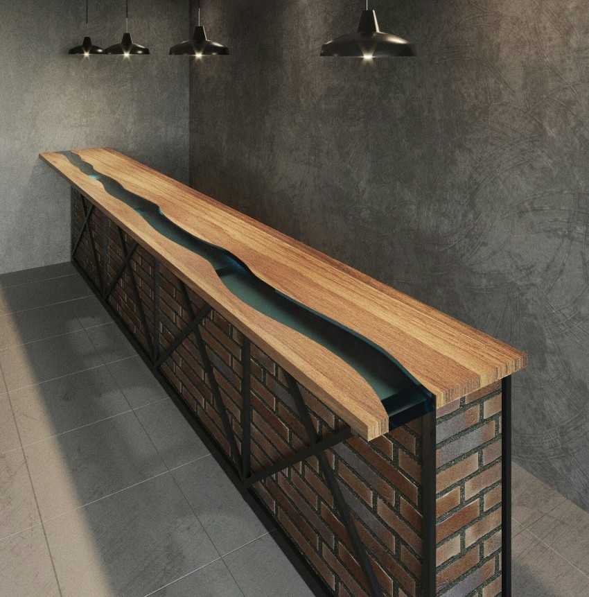 Свое название подобные изделия получили благодаря характерному дизайну. Стол река из эпоксидной смолы имеет вставку по центру столешницы, внешний вид которой напоминает реку, протекающую через горное ущелье. Чаще всего такие изделия изготавливаются из массива. Вставку выполняют синего или зеленого цвета с неровными краями.