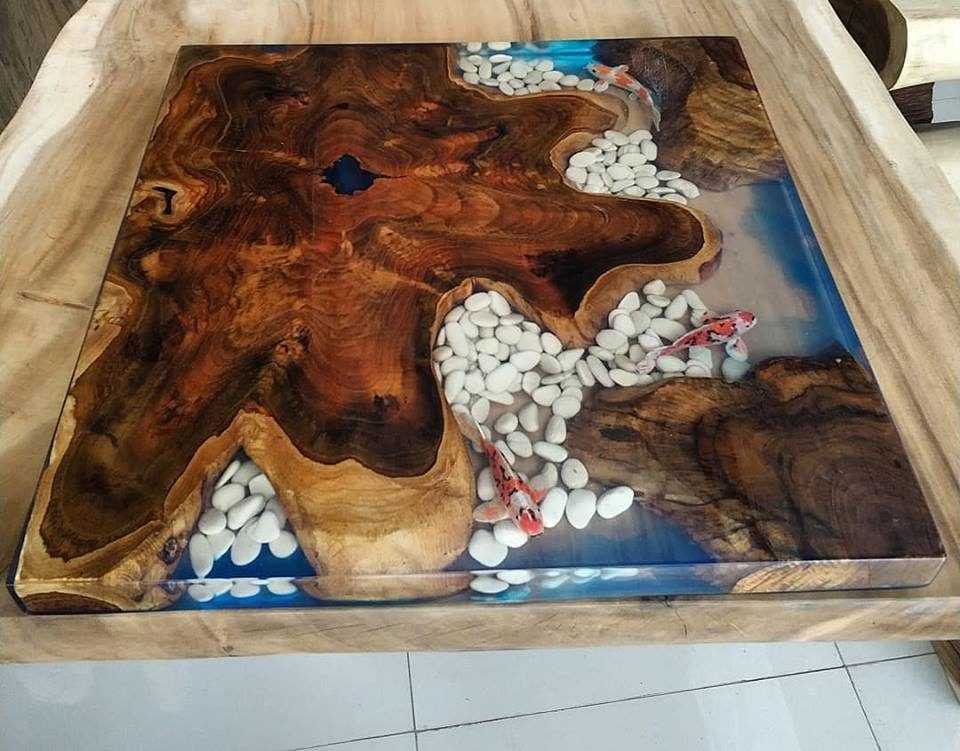 По мнению многих ценителей самые оригинальные изделия – это столы из эпоксидной смолы и дерева, по своему виду напоминающие самые настоящие водоемы. Делаются они также методом стандартной заливки, однако мастера стараются придать им отличительные изюминки.