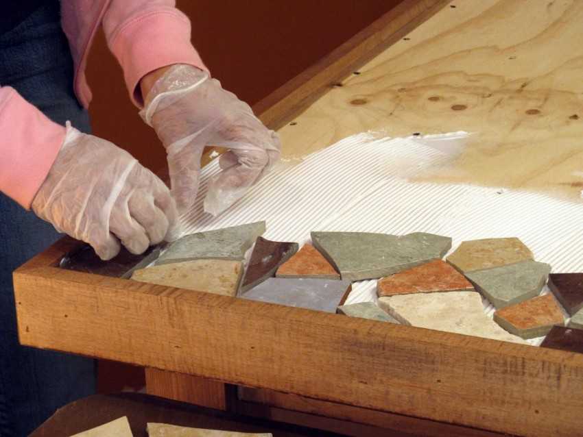 С этой же целью можно в хаотическом или четко продуманном порядке разместить по столешнице натуральные или искусственные камушки. Таким образом изделию придают яркий и эффектный вид.