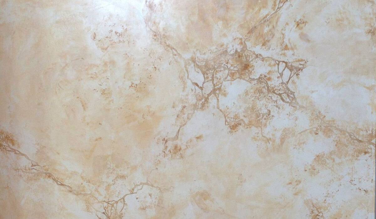Наносится шпателем. Задача мастера в том, чтобы повторить естественный рисунок камня, своеобразные «разводы» и «наплывы», жилки. Выгладит такое покрытие благородно и дорого. На практике же, научиться делать стены под гранит и мрамор не сложно: