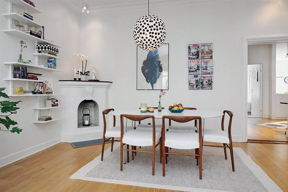 - Вторая схема более классическая. Она подразумевает расстановку акцентов равномерно по всему интерьеру. Для этого выбирают еще несколько ярких деталей в цвет стульев. Зачастую такими деталями выступают лампы и светильники.