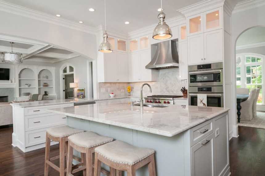 Тут с большего вкусовщина, но есть один универсальный вариант — белая кухня с деревянной столешницей. Это идеальный вариант по комбинации внешнего вида, цены и практичности. А ещё их практически нереально испортить. Серьёзно, многие пытались и делали всё остальное просто ужасно, но получалось всё равно как минимум неплохо.