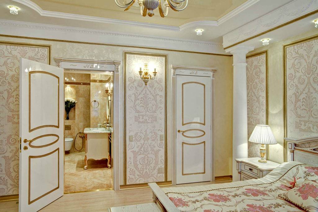 Ярко-золотые светлые межкомнатные двери в интерьере жилья отлично подходят для стилей барокко, классика и кантри. Их прямое назначение создать величественный вид и поражать воображение гостей. Особая гармония достигается когда дверная конструкция сливается со стенами, оформленными в такой же гамме.