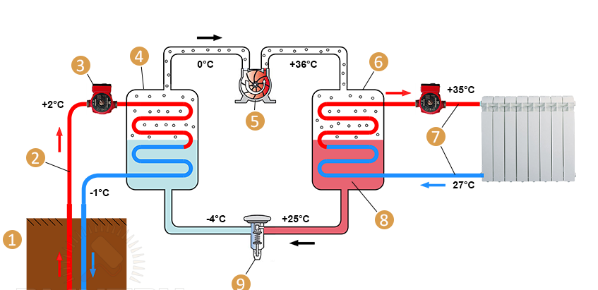 1 — земля; 2 — циркуляция рассола; 3 — циркуляционный насос; 4 — испаритель; 5 — компрессор; 6 — конденсатор; 7 — система отопления; 8 — хладагент; 9 — дроссель