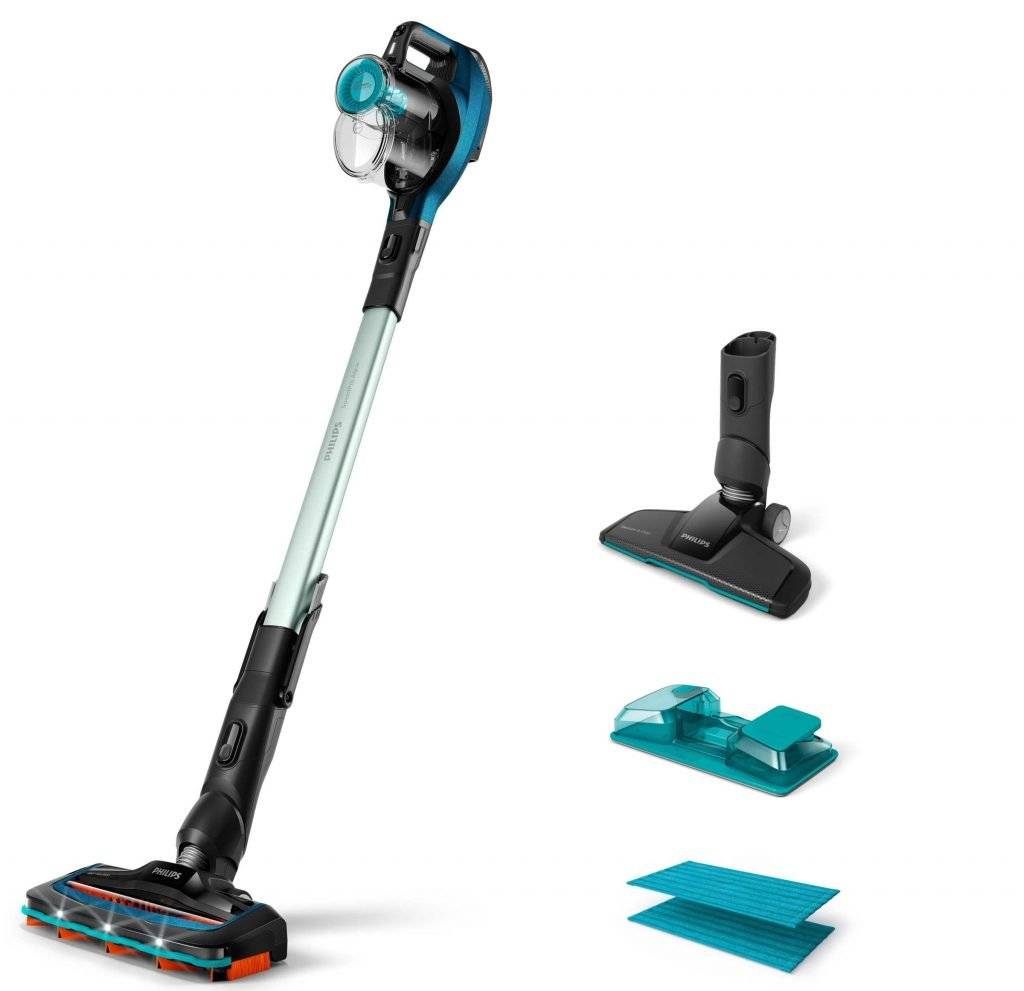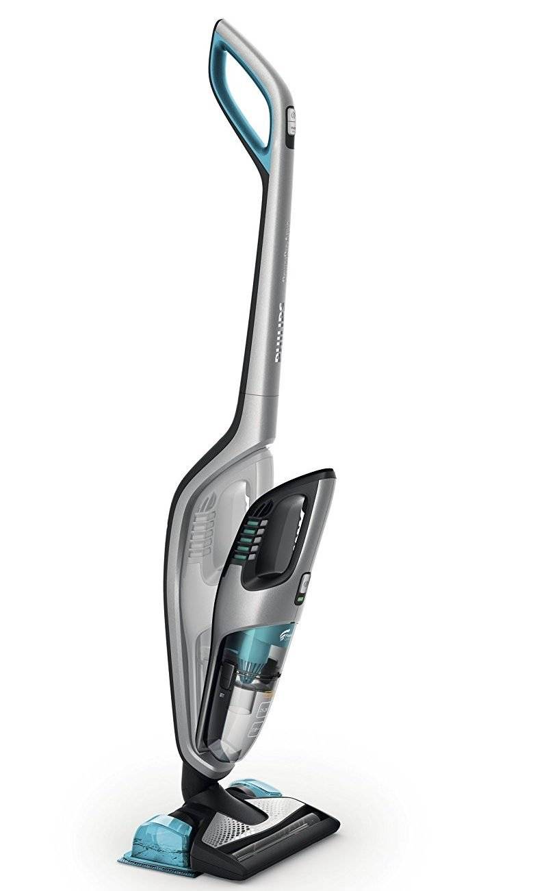 - Вертикальные пылесосы Philips обладают видом щетки, в утолщенной рукоятке которой расположены все функциональные узлы. Они оборудуются циклонными или матерчатыми фильтрами. Перемещать их несколько сложнее, но в индивидуальных домах с большой площадью помещений и наличием лестниц они оказываются более удобными.