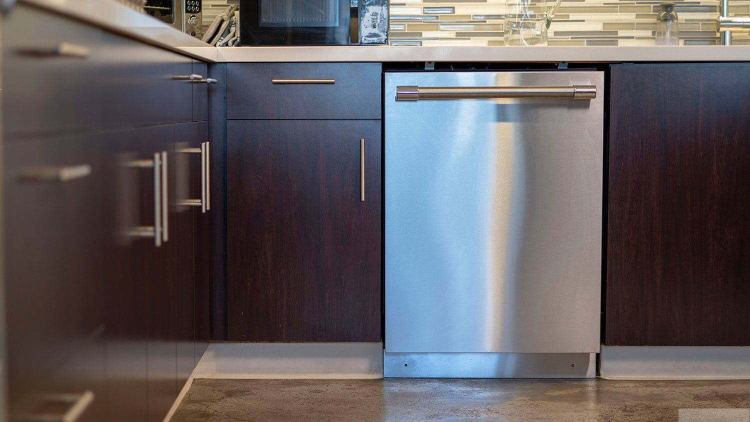 Под панелью навешивается либо декоративная панель, либо мебельный фасад. Частично встраиваемая посудомоечная машина поможет аккуратно вписать ее в кухонный интерьер, оставив на виду только дверцу.