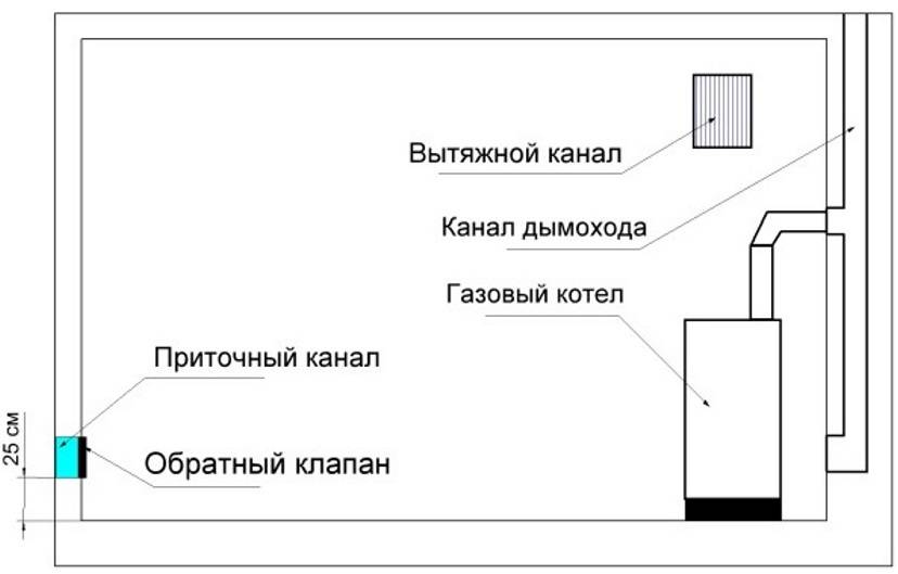 - Приточная вентиляция в котельной с газовым котлом должна обеспечивать трехкратную смену воздушных масс в течение каждого часа.
