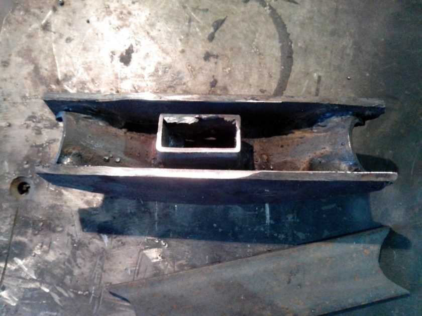 - В крайней части верхнего швеллера высверливается сквозное отверстие, в котором на резьбовую втулку монтируется отрезок верхнего швеллера недостающей длины. Под отрезком устанавливается домкрат, который упирается подъемником в регулируемую пластину.