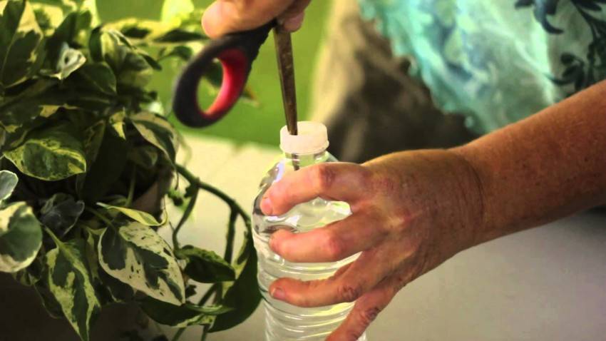 Пластиковая бутылка 1.5-2 л также может пригодиться в общем деле. Крышку емкости прокалывают в нескольких местах. Поперечное расстояние проема равняется не более 2 мм. Малые отверстия делаются горячим гвоздем.