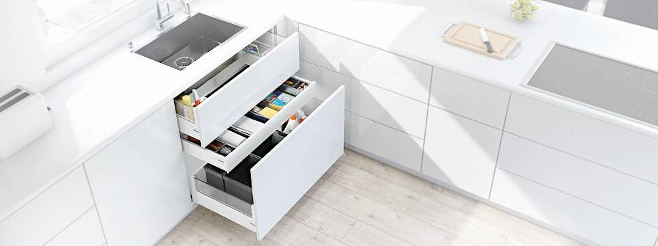 - выдвижные ящики — в угловых шкафах их выполняют П-образными, чтобы не повредить коммуникации. Пригодятся для хранения мелких предметов и текстиля;