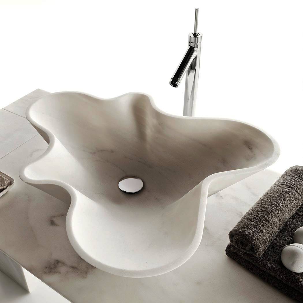 Мраморная накладная раковина в форме кляксы – вариант для творческих личностей. Данная форма хороша тем, что в ней нет ничего стандартного, однообразного, консервативного. Полная свобода линий и натуральный мрамор.