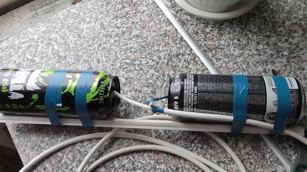 - Соедините их между собой медным проводом и выведите вниз. Можно подсоединить усилитель, а к нему антенный кабель. Таким образом, у вас получится очень эффективная антенна, которую можно использовать и на улице.