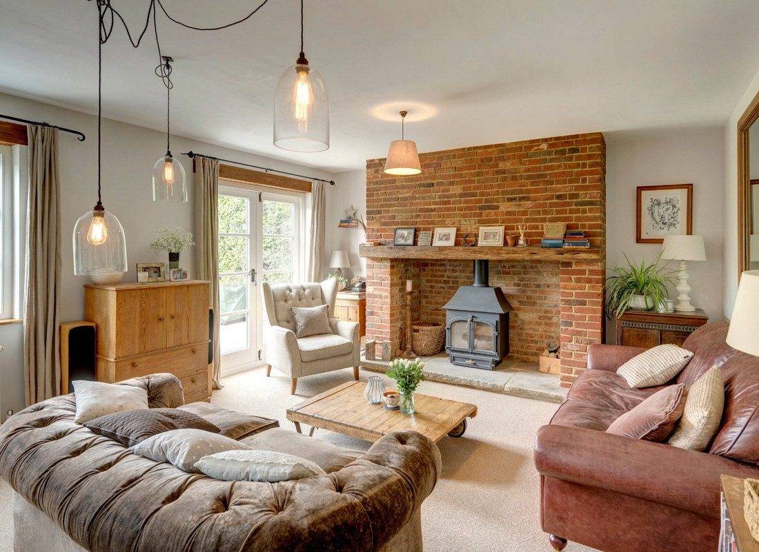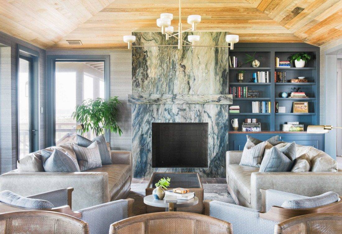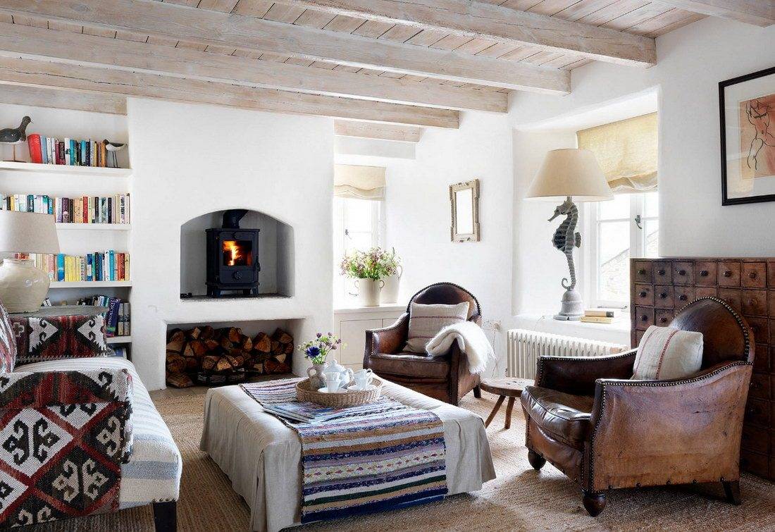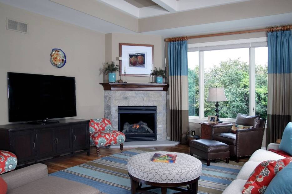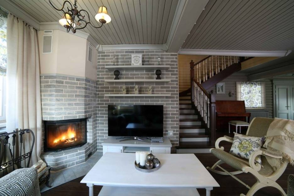 Угловой кантри-камин в интерьере гостиной загородного дома