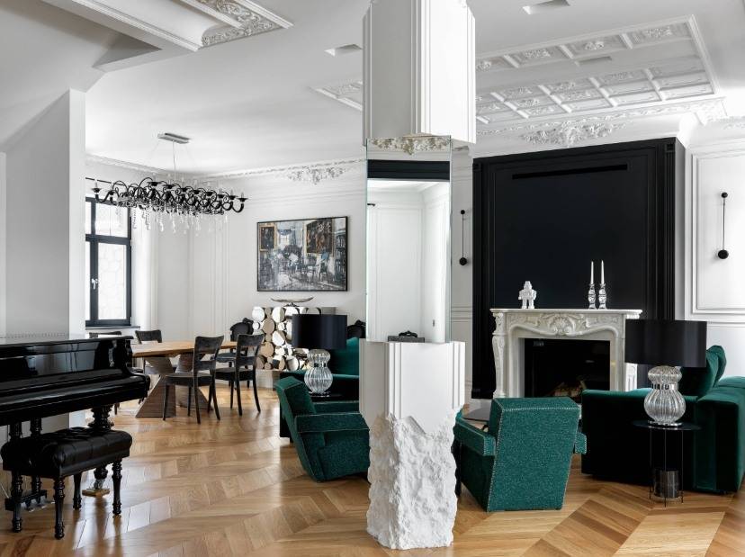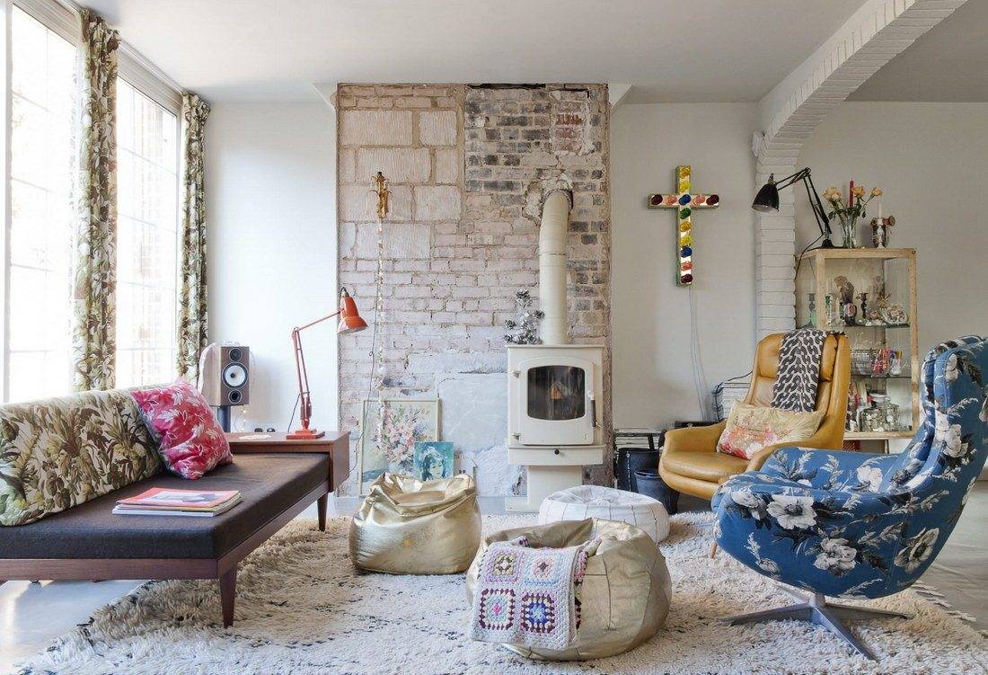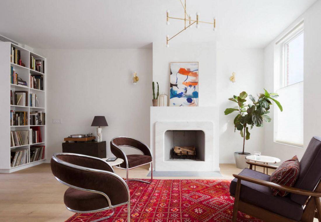 Интересно оформленная гостиная в стиле ретро и кирпичный камин в белом цвете