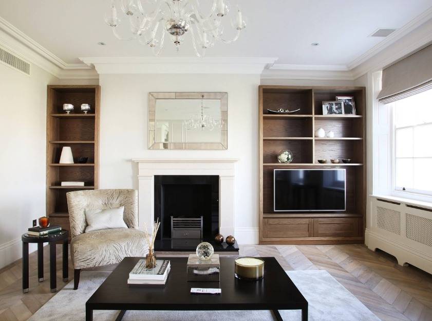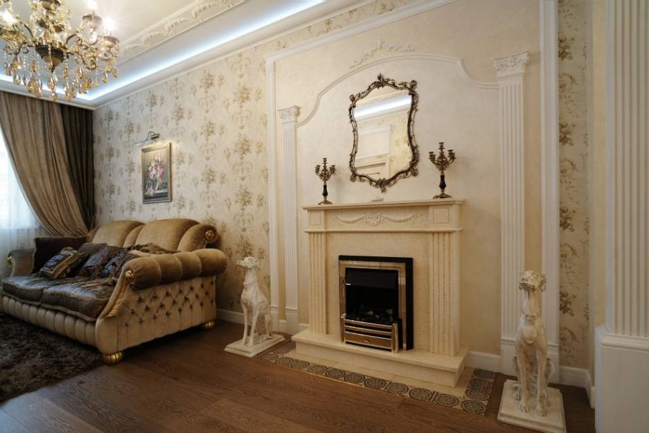 В основном гостиные с камином оформляют в классическом стиле. Выглядит это невероятно красиво, изысканно. Только представьте, светлые стены, элегантная мебель из дерева, роскошный диван, лепнина, довольно большая люстра. Не удивительно, что в таком интерьере камин будет выглядеть наиболее уместно. Что касается его оформления, то чаще всего фасад выполнен из камня или дерева, а декор при этом отсутствует. Это позволяет добиться элегантной сдержанности. В основном над таким камином расположено крупное зеркало, картина или же полки с декоративными предметами.