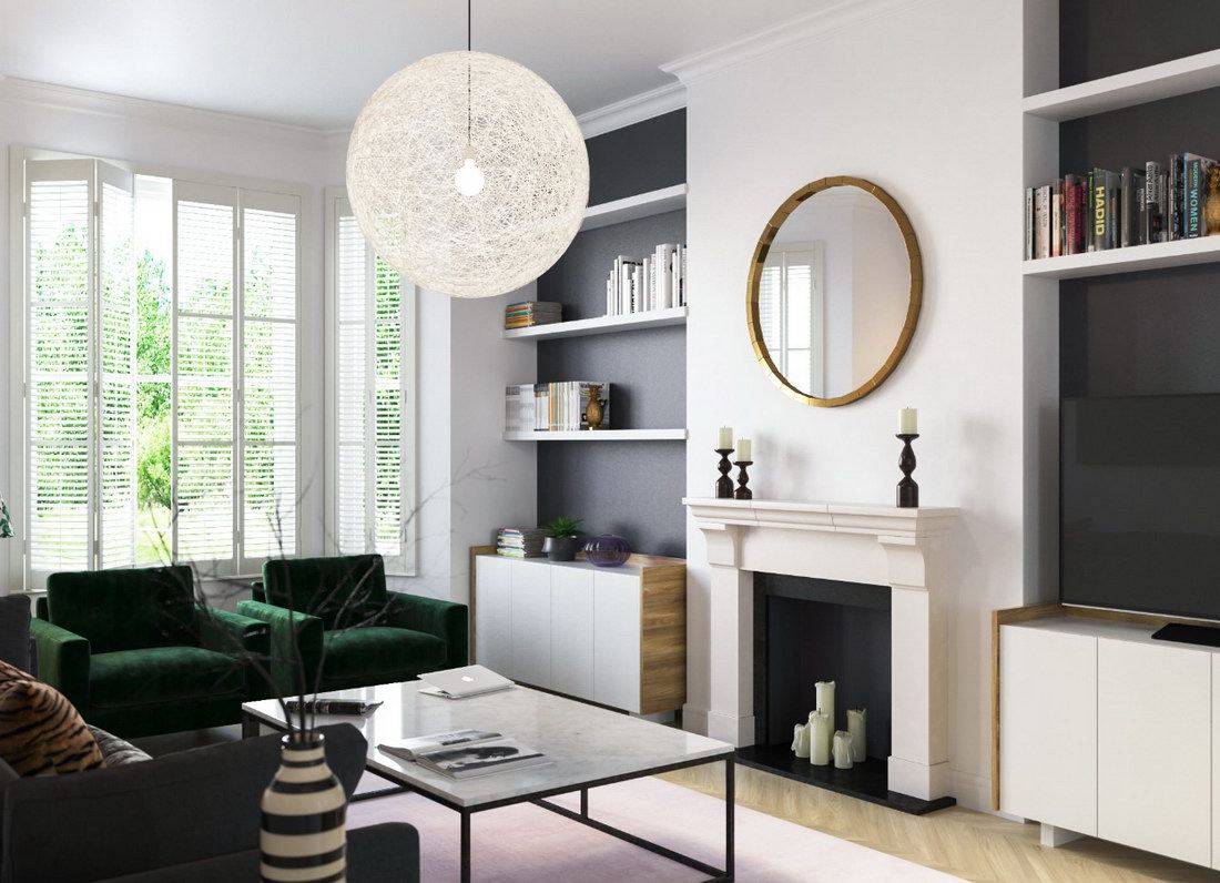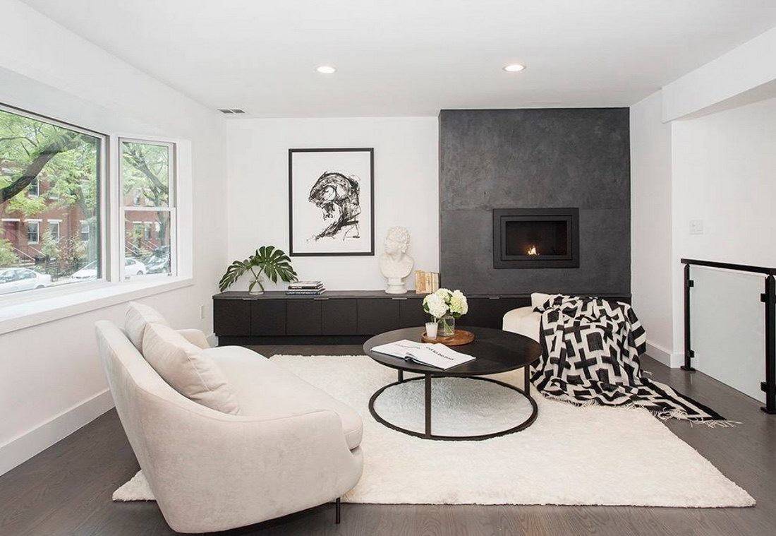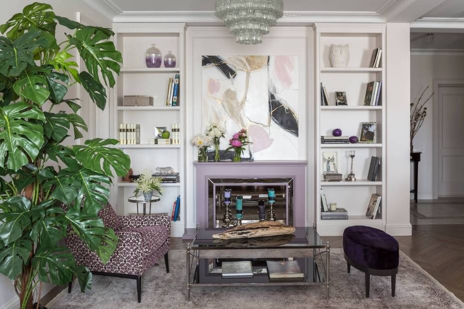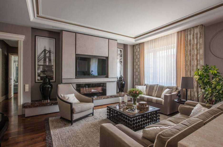 В современном мире стиль модерн в основном заключается в сочетании спокойных оттенков с контрастными тонами, а также простоте и рациональности. Кроме того, нередко в такой гостиной используется большое количество зеркал и стеклянных акцентов. Все это помогает визуально расширить пространство. Чаще всего такое оформление можно увидеть в частном доме. Ведь только в большой комнате можно установить камин по центру, тем самым сделав его главным очагом в доме. Если модерн был выбран для оформления квартиры, используйте фальш-камин. Но помните, что в таком случае топка должна быть ярко-выраженной с имитацией пламени и дров.