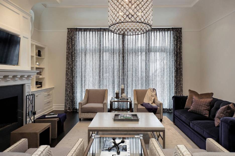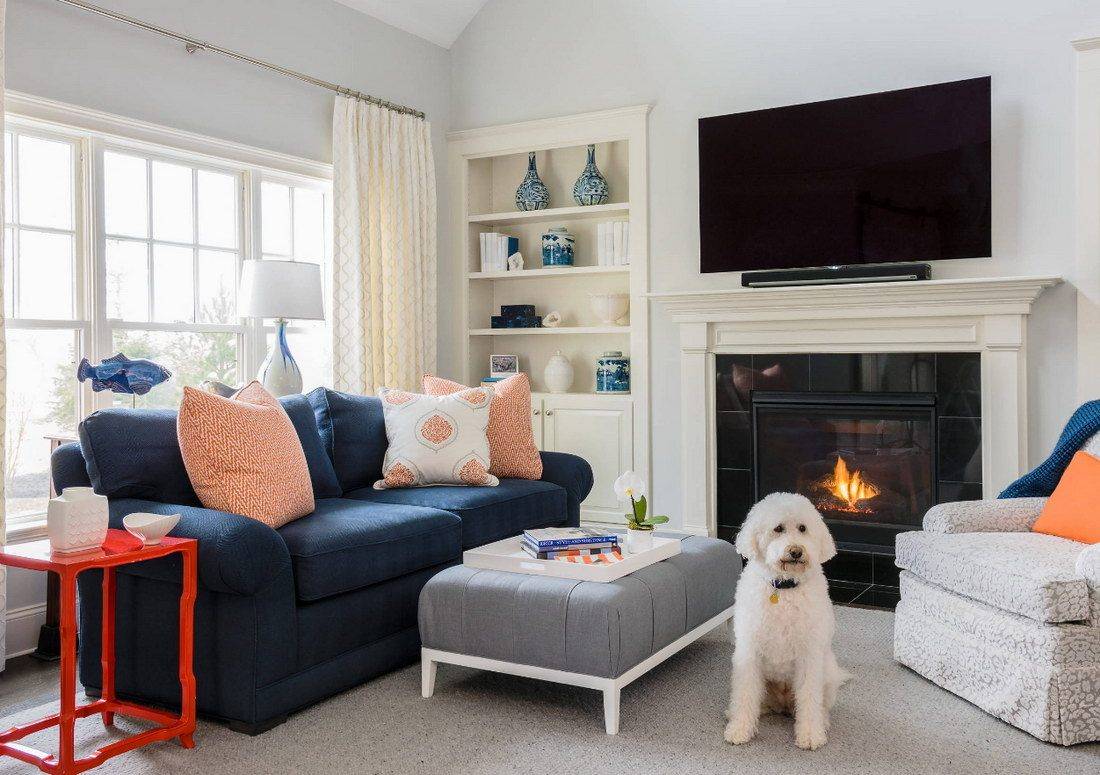 Своеобразной классикой стала лаунж-зона, которая состоит из нескольких кресел, торшера и стильного журнального столика. В некоторых случаях здесь также может быть расположен большой комфортный диван с декоративными подушками. Но всегда учитывайте параметры комнаты. Поскольку в узкой гостиной даже небольшое количество мебели может сделать камин незаметным. При желании это пространство можно дополнить небольшим пуфиком для ног или же креслом-качалкой. Независимо от выбранного варианта, рекомендуем расставлять предметы мебели не ближе, чем 1,5 м от источника огня. Это обусловлено правилами безопасности.