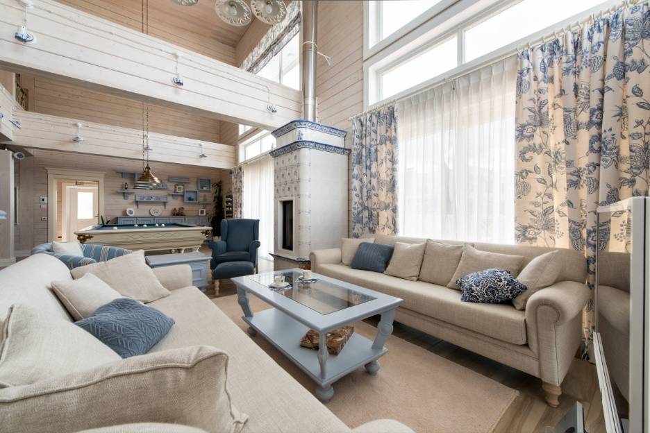 Оформление гостиной в стиле прованс до сих пор несет в себе отпечатки южных стран. Легкий оттенок старины в сочетании с романтикой позволяет создать действительно удивительный интерьер. Отделка камина в данном случае преимущественно выполнена в виде открытого кирпича. Кроме того в таком помещении всегда есть много деталей с цветочным принтом. Чаще всего стиль прованс используется для загородного дома или дачи, а в городских квартирах его реализуют крайне редко.