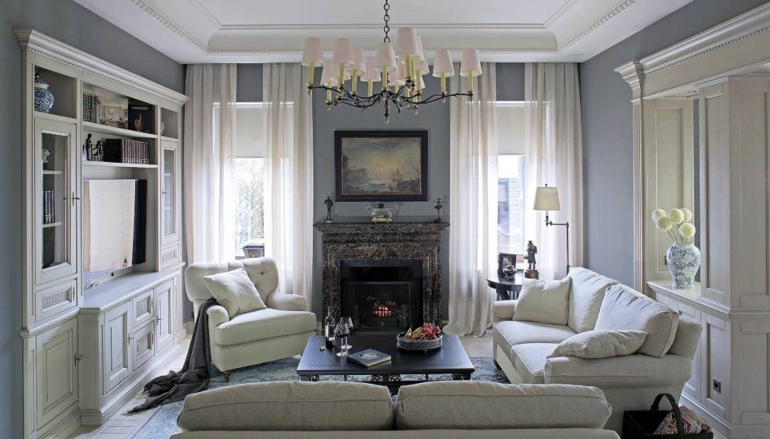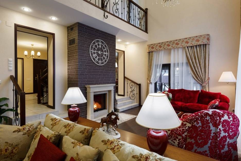 Данный стиль практически не встречается в уютных, небольших квартирах. Его преимущественно выбирают обладатели больших загородных домов. В них естественно предусмотрен массивный классический камин. Кстати в случае, если он выложен из камня, не стоит рассчитывать на ровные, гладкие линии. Что касается интерьера в целом, то гостиная должна быть оформлена со вкусом. Различные трофеи с охоты и оружие – самые распространенные декоративные детали подобных помещений.