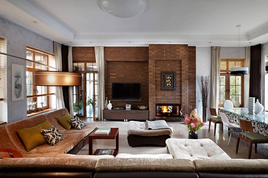 Из современных направлений просторный зал требуется только для стиля лофт. Там камин должен быть внешне максимально простым и грубым, идеально будет выглядеть встроенная в кирпичную кладку модель.