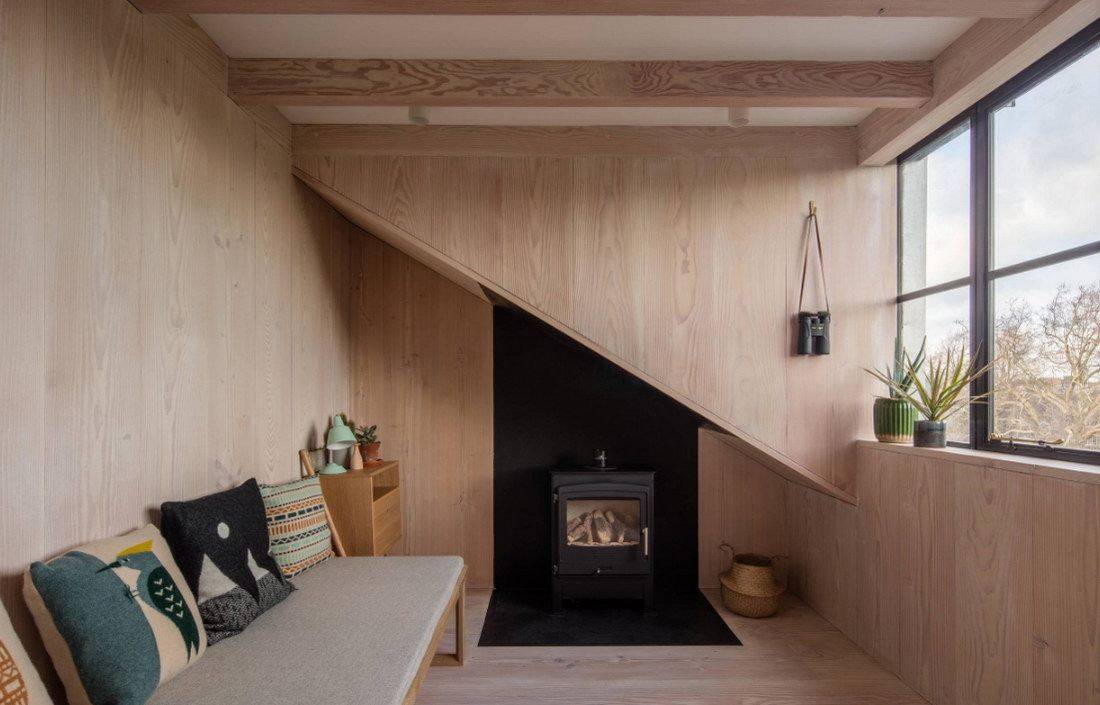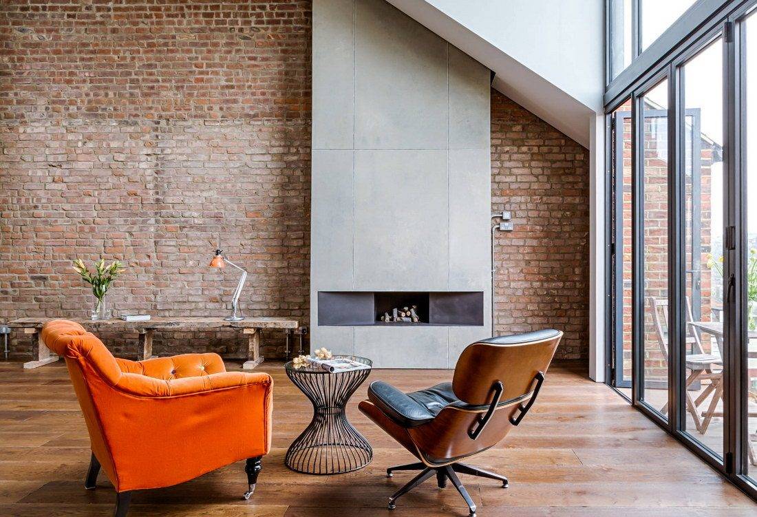 Экстравагантная лофт-гостиная с установленным в ней угловым камином