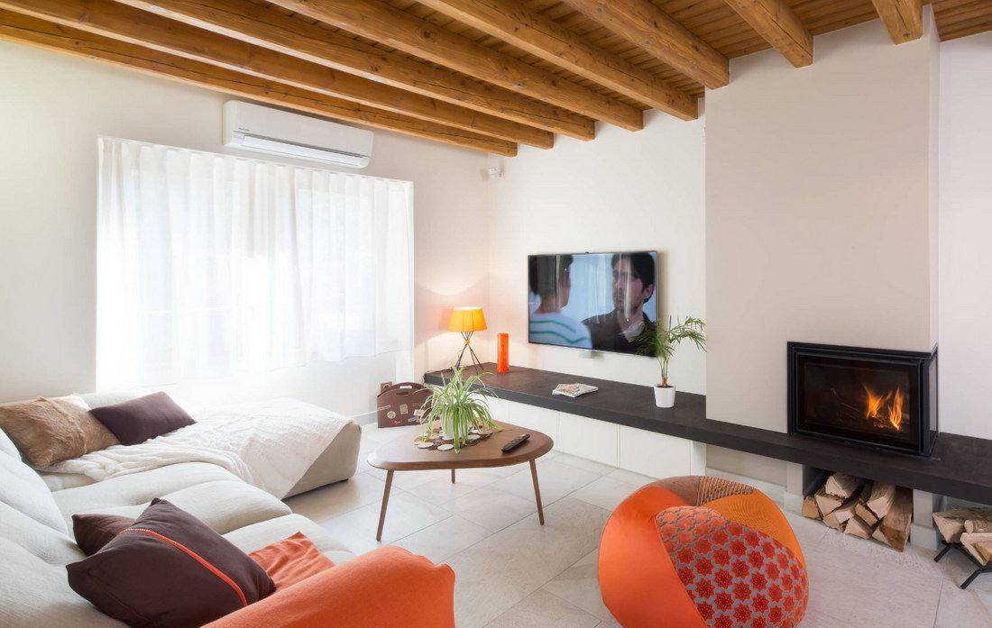 Сочетание камина с современной техникой – это спорный вопрос. Конечно же, в идеальном варианте интерьер гостиной с камином предполагает отсутствие телевизора. Ведь в таком пространстве надо наслаждаться общением и совместным времяпрепровождением вместе с близкими людьми. Но если другого варианта нет, то лучше всего разместить их на одной линии. Альтернативным вариантом будет приобретение углового камина. В таком случае телевизор будет расположен не рядом с ним. Благодаря этому, при желании можно будет наслаждаться теплом камина и в то же время смотреть любимый фильм.