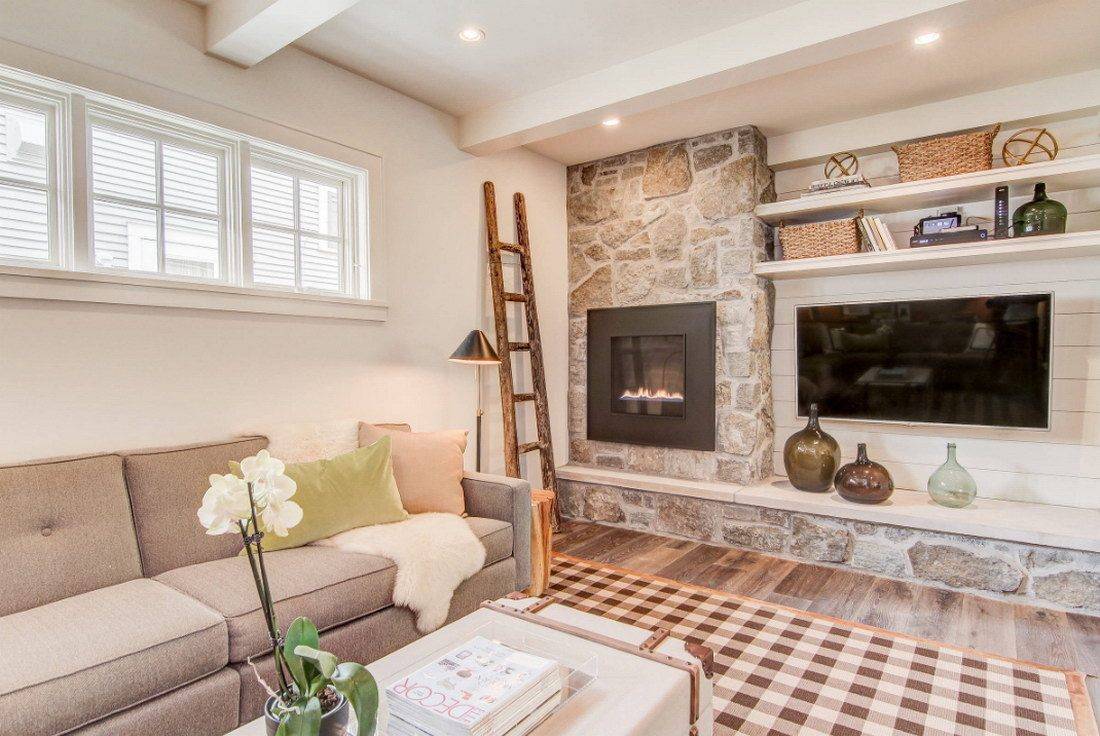 Камин, декорированный камнем, устанавливается в интерьере уютной гостиной