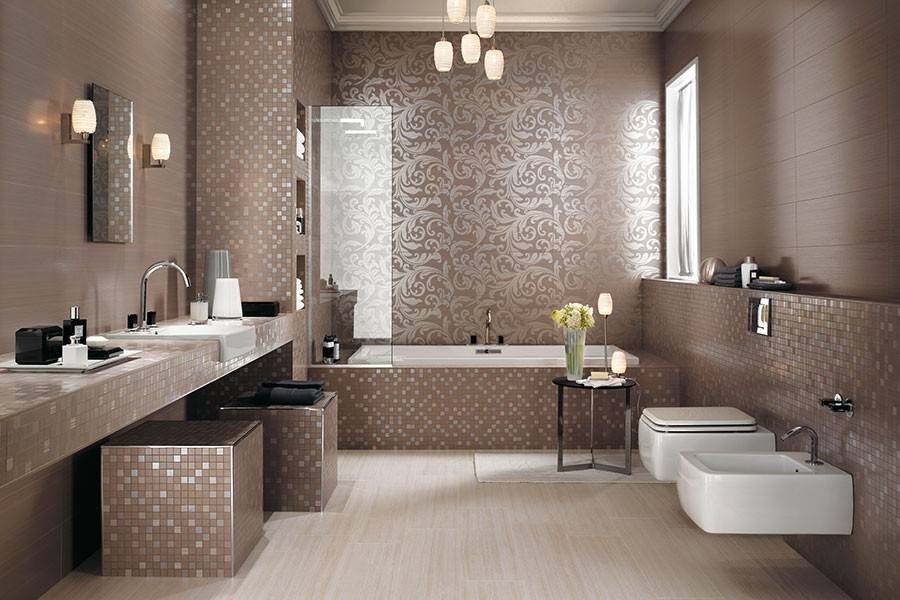 Уйдя от ярких цветов и масштабных рисунков на поверхности, вы сможете визуально расширить пространство. Возможна укладка плитки с неброским, чуть заметным узором или орнаментом.