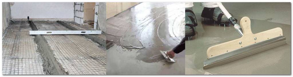 Далее пол следует выровнять. Для этого можно настилать листы фанеры или гипсокартона. Однако лучшим вариантом станет укладка бетонной стяжки. Однако не стоит забывать, что используя третий метод, следует запастись большим количеством грунтовки, так как она понадобится еще раз, когда готовая стяжка высохнет.