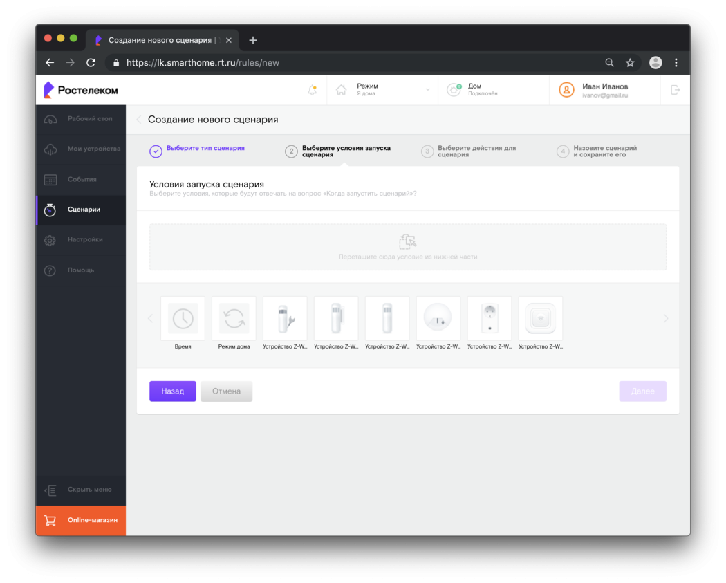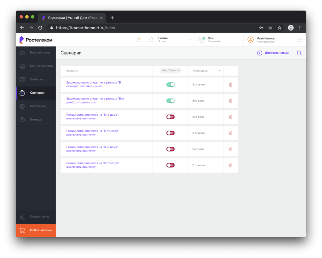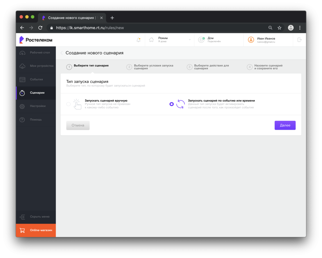 Разработчики Ростелекома создали отдельный ЛК для абонентов рассматриваемой системы. В нем доступна регулировка своих устройств, задавать им сценарии работы, редактировать профили пользователей и так далее.