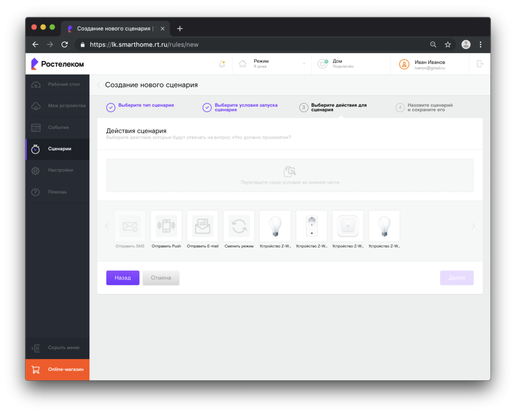 - Действия сценария; можно настроить действия устройства по сценарию.