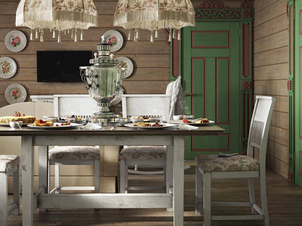 Особое отношение к подбору натуральных материалов. Не всякая древесина позволит сделать желаемый интерьер – для этого лучше всего подходит береза, лиственница, дуб, ясень или сосна. Темная древесина, особенно красноватых тонов, в русском стиле дизайна не используется