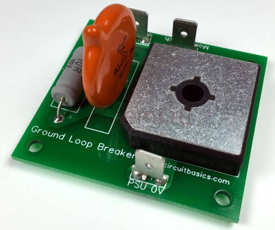 Контур заземления — это ток, который течет от источника звука к усилителю через заземляющий экран входных аудиокабелей. Этот ток будет улавливаться на входе усилителя и вызывать раздражающий гул. Советуем использовать дополнительную цепь, расположенную между заземлением основной схемы и соединением шасси, чтобы убрать ток контура заземления: