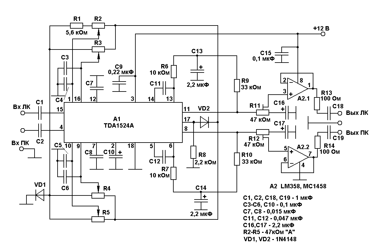 На глаза попалась схема усилителя для наушников, которая называлась «Блок регулирования громкости и тембра для стереонаушников». (Автор — Анджей Космински, Hobby Elektronik, №2/2000, c. 48–49). Сами регуляторы громкости и тембра выполнены на микросхеме А1 – TDA1524A в типовой схеме включения. (Так было написано в журнале, в оригинальном описании на микросхему схема немного другая. Но здесь схема приводится именно в «опубликованнном» виде).