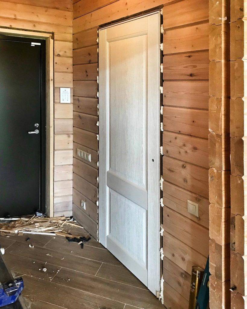 На этом монтаж межкомнатной двери завершается. Когда сруб будет продолжать давать усадку, обсадной короб не даст ему деформировать установленные двери. Их функциональность не пострадает и они прослужат долгий срок.