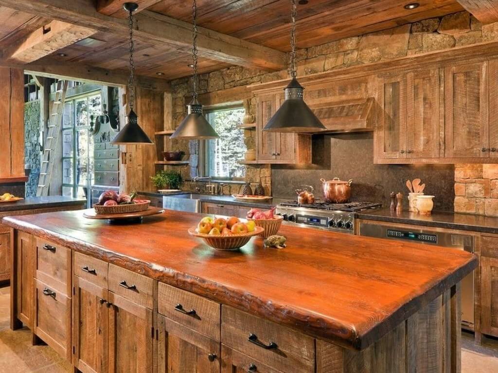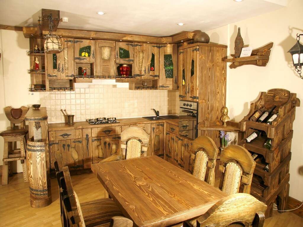 Если кухня устанавливается в деревянном доме в деревне, либо в квартире, с соответствующим антуражем, то подобный гарнитур желательно дополнить аналогичным столом и стульями, либо табуретками. Их дизайн может в точности повторять интерьер кухни, либо может быть дополнен вставками из стекла, камня либо резных элементов.