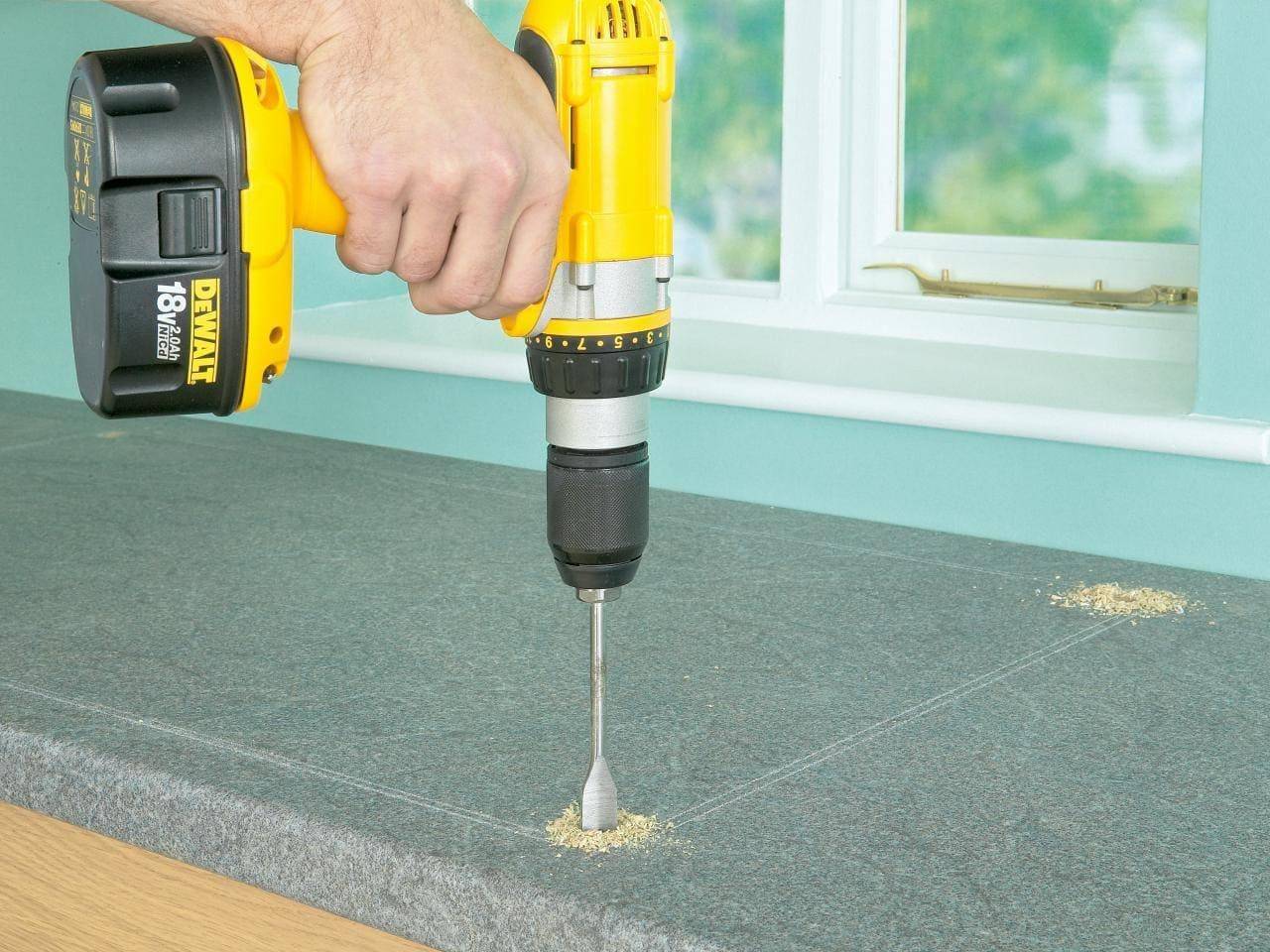 Перед выпиливанием контура в столешнице, нужно проделать стартовое отверстие. Это делается для того, чтобы загнать полотно лобзика. Зазор делают с помощью сверла (10-12 мм). Для практичности, можно сделать сразу несколько таких отверстий.