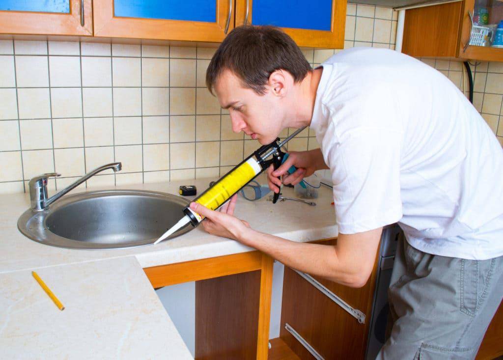 После фиксации уплотнителя, необходимо обезжирить стыки. Сделать это можно использовав обычную губку для мытья посуды, смоченную в бензине или растворителе. После просыхания швов, наносится герметик. Его линия должна быть цельной и не слишком густой. Иначе, на этапе фиксации кухонной раковины, вещество выступит из швов.