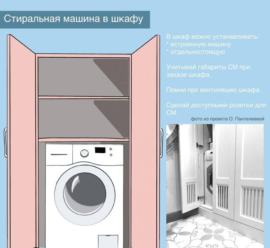 Встраиваемая стиральная машинка отлично экономит пространство в квартире или доме. Можно соорудить тумбу для стиралки, поместить ее в шкаф, в полочку, вмонтировать в стену и прочие места. Только такие креативные идеи должны быть тщательно продуманы, во избежании неприятностей.