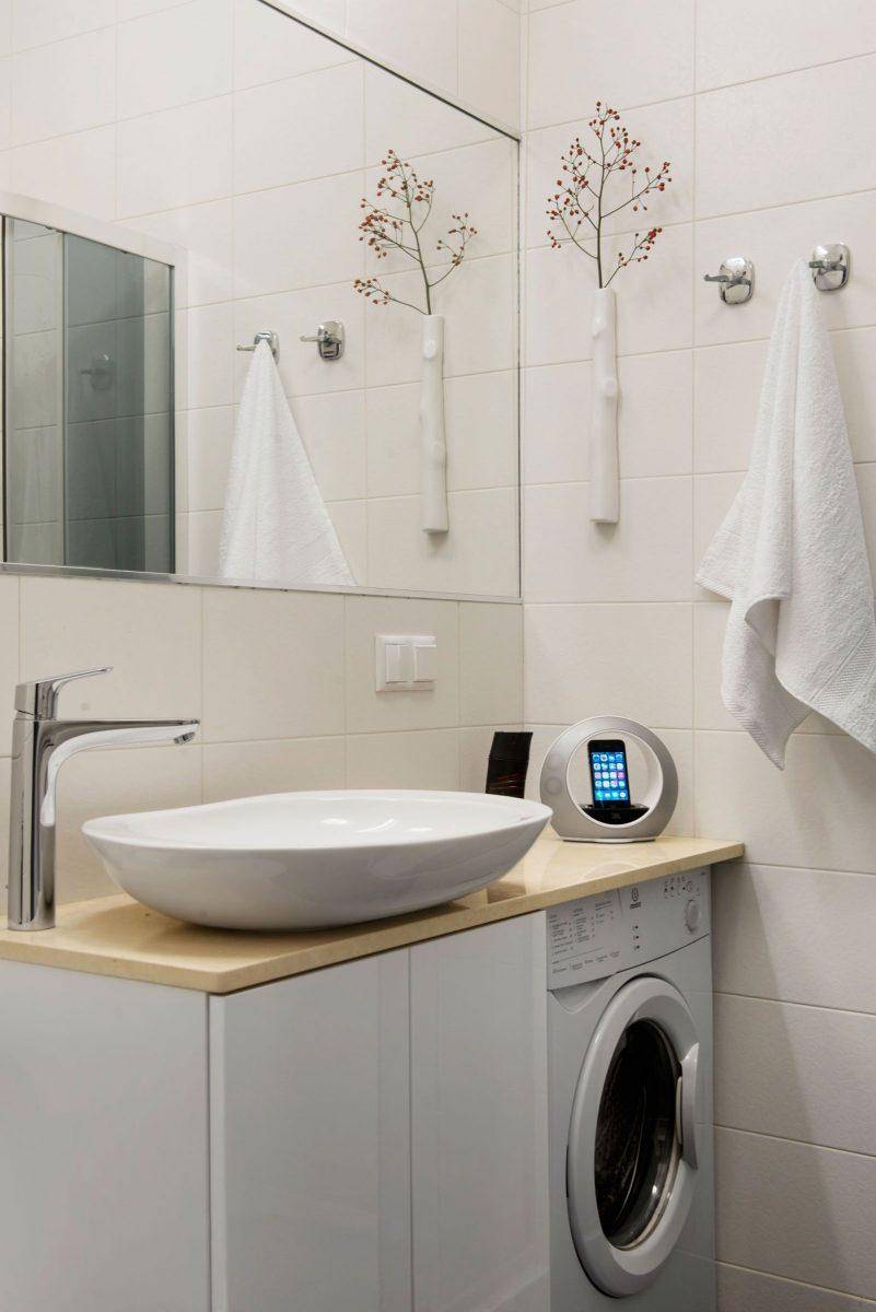Стиральную машину можно разместить и в малогабаритной ванной комнате, предварительно определившись с размерами и местом. В данном случае для экономии пространства машину установили под раковиной