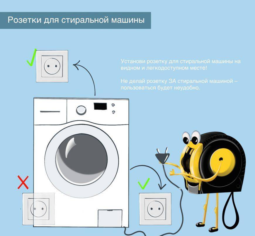 К необходимым условиям для работы стиральной машины относится близкое расположение розетки и воды. Это поможет избежать удлинения электрических кабелей и шлангов.