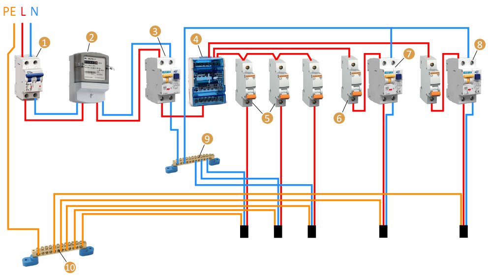 Схема подключения УЗО: 1 — вводной автомат; 2 — счётчик; 3 — общее селективное УЗО; 4 — кросс-модуль; 5 — автоматы осветительной сети; 6 — автомат для защиты УЗО; 7 — УЗО первой группы 10 мА; 8 — УЗО второй группы 30 мА; 9 — нулевая шина; 10 — шина заземления