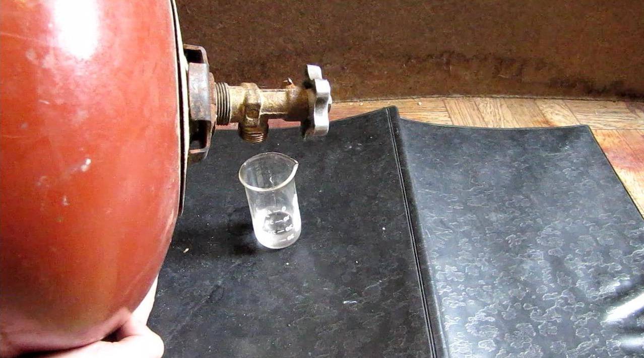 На дне баллона иногда скапливается жидкий водяной конденсат, поэтому после извлечения вентиля обязательно нужно перевернуть емкость, чтобы из нее могла вытечь вода.