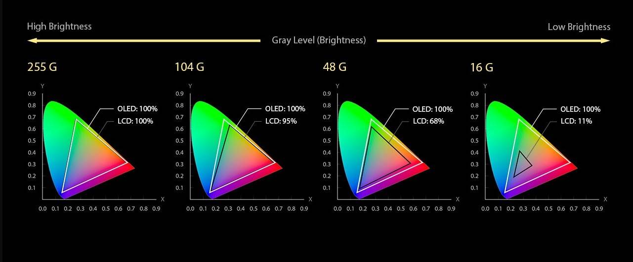 Поскольку в LCD и LED светятся не конкретные пиксели, а подсветка под группами пикселей, даже кристально черный экран будет немного засвеченным — «сероватым». В OLED светятся исключительно те пиксели (диоды), что должны. В результате контрастность OLED-дисплеев может достигать миллиона к одному, в то время как LED-варианты предлагают тысячу к одному.